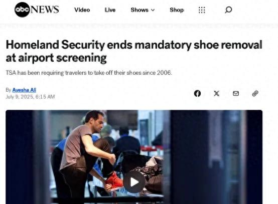 据美国广播公司7月9日报道,美国国土安全部部长克里斯蒂·诺姆于当地时间周二宣布,美国已不再要求旅客在美国各处机场通过安检时,进行脱鞋检查。