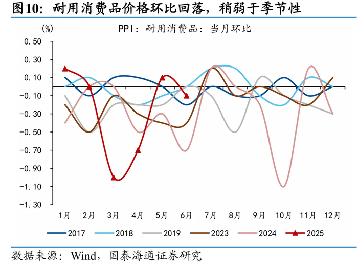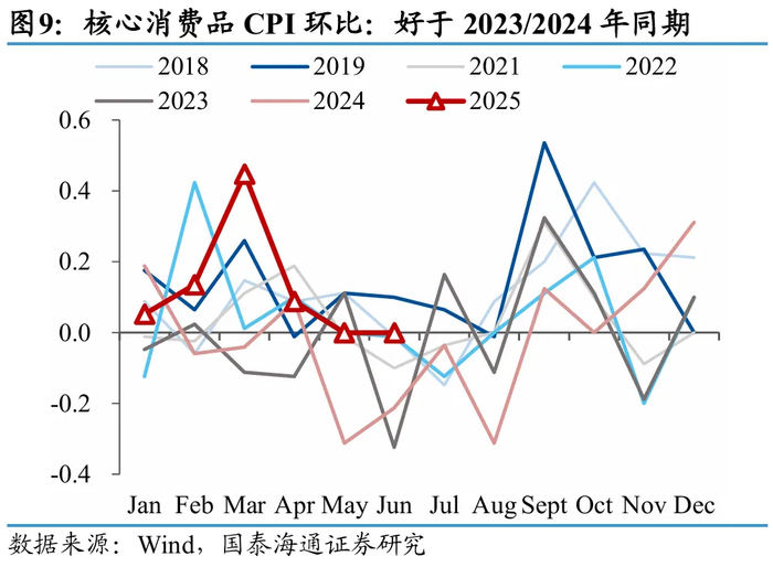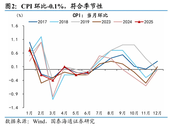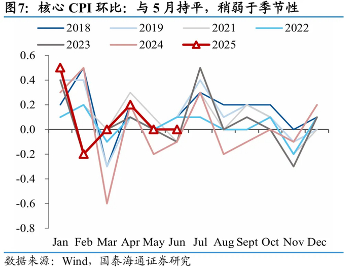 6月CPI同比转正。食品价格拖累减弱;国际油价上涨输入带动能源价格;核心CPI环比持平,核心消费品CPI环比表现显著好于2023、2024年,“618”提前促销影响过去后,“以旧换新”政策支持的相关品类价格仍相对偏强,而服务相关价格继续稳中偏弱。
