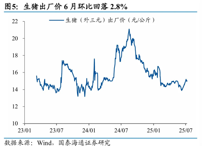 猪价方面,6月高温天气持续,仍处于消费淡季,猪肉CPI环比下跌1.2%,生猪出厂价环比回落2.8%。不过6月中下旬开始猪价开始反弹,截至7月8日已来到年内高点15.1元/公斤,一方面近期头部企业主动减少出栏量,另一方面高温天气影响物流运输效率。