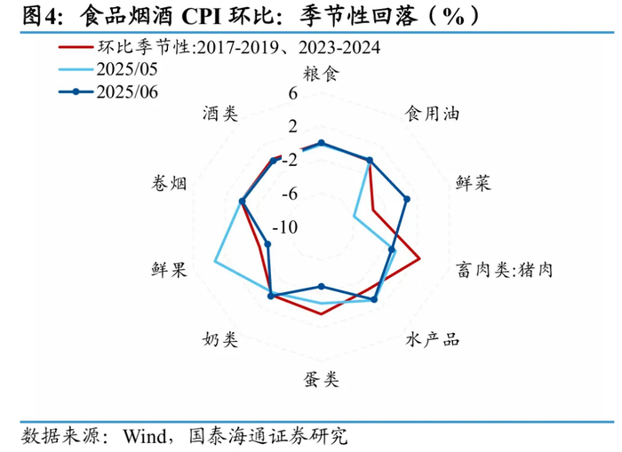 从分项看,6月食品价格环比下降0.4%,降幅低于季节性。6月高温、降雨天气较往年偏多,影响农作物供应,推动食品价格边际改善。具体来看,鲜菜价格环比上涨0.7%,高于季节性水平,水产品上涨0.7%,同样好于历史同期平均。