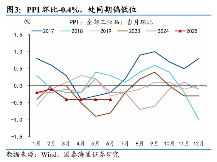 6月PPI同比跌幅继续扩张,一是受高温降雨天气影响,房地产、基建项目施工进度有所放缓。二是“反内卷”具体政策和效果仍待观察,尤其是对光伏、水泥、钢铁等行业实际供需格局的影响。三是外需不确定性持续,出口相关行业价格承压,“以价换量”仍在持续。