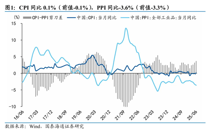 事件:2025年7月9日,国家统计局发布2025年6月物价数据,CPI同比上涨0.1%,PPI同比下降3.6%,降幅继续扩张。