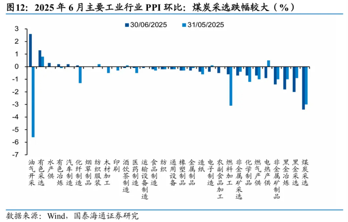 分行业来看,油气开采领涨,煤炭采选、黑金采选跌幅较大。6月国际原油价格和大幅上涨,带动国内油气开采价格环比上涨2.6%。煤炭采选价格下跌3.4%,一方面煤炭供给相对稳定,另一方面需求端由于夏季太阳能、水力发电增多,绿电对火电的替代作用增强,从而形成拖累。