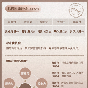 在同业评价方面,评审委员会由券商研究所、独立财富管理机构、媒体等高级管理人员组成,其中领导力评估模型包括前瞻力、控制力、创新力、合规性、影响力五大维度,评审委员对领军人物领导力能力进行打分(打分维度为1-10分),最终综合所有评分并进行百分制换算,最终得出同业评价总得分。