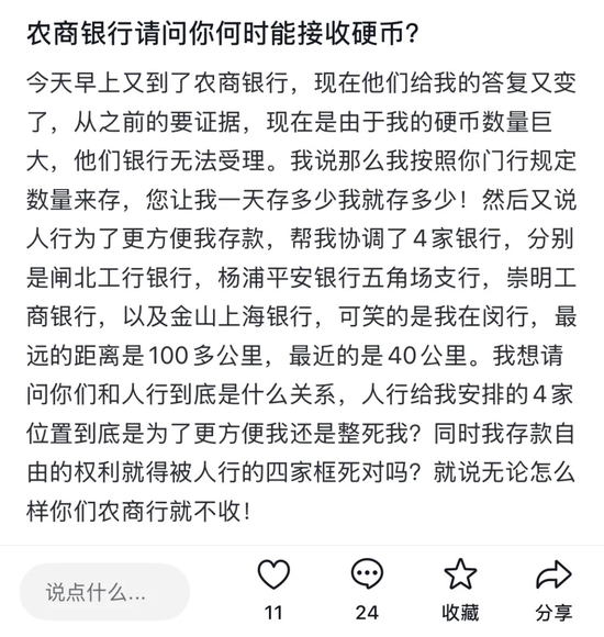 陆先生则就协调网点一事在社交平台上发文道,上海农商银行所述经人行协调至的兑换网点,最近网点距其所在地40公里,最远达100公里,以“不方便”以及“存款自由”为由而拒绝。