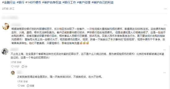 据某社交平台评论区对此事热议消息,日前湖南部分银行发布内部通知显示,“长沙地区也出现了一些客户,一次性兑换大量残缺污损的硬币,数量高达5000枚左右。这些硬币有的变形、火烧、磨损,根本无法辨别真伪。客户还威胁要向银行投诉,声称银行拒收残损硬币。 但是该通知里人行明确说明了,这是一批按斤收购的硬币,各省流窜试探要求银行回收,相关事实人民银行已掌握,投诉无效。”