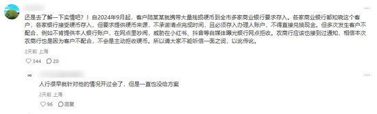 不过在梳理过程中,《行长速览》亦发现,有上海ip网友称陆先生已非首次因硬币兑换与银行起冲突,据悉,不少商业银行都知晓这个客户,各家银行接受硬币存入,但要求提供硬币来源,不承诺清点完成时间,且必须存入办理人账户,不得直接兑换现金,但多次发生客户不配合,例如不肯提供本人银行账户,在网点里吵闹,威胁在小红书、抖音等自媒体曝光银行网点拒收。