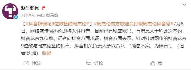 昨日,抖音辟谣花上亿签约周杰伦入驻,歌迷会打假周杰伦抖音号:静候官方消息。