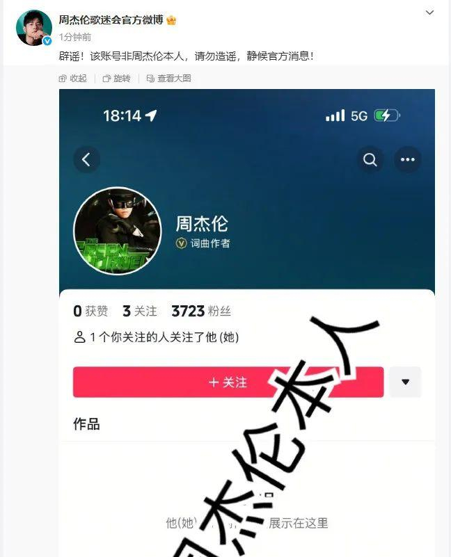 此外,@周杰伦歌迷官方微博 也打假抖音上出现的周杰伦账号,称“辟谣!该账号非周杰伦本人,请勿造谣,静候官方消息! ”