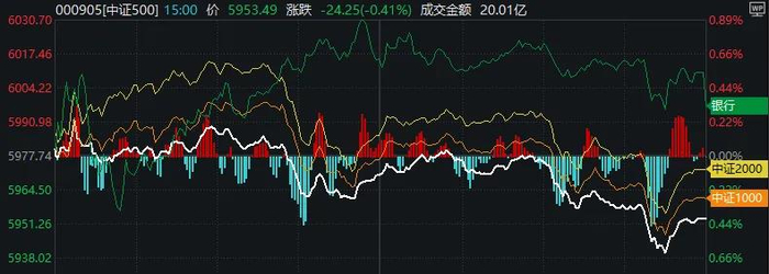 数据显示,临近上午收盘,当银行板块进一步拉升,中证500、中证1000、中证2000等代表中小盘股的指数纷纷跳水。