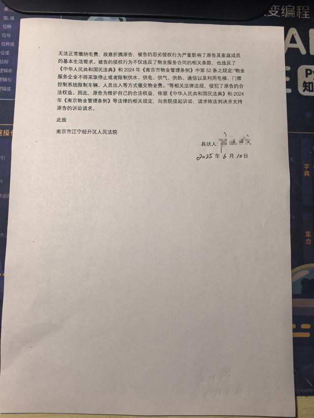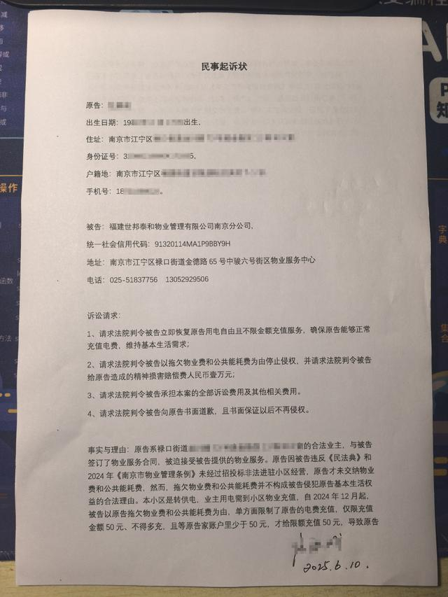 无奈之下,任先生在2025年6月10日将福建世邦泰和物业管理有限公司南京分公司诉至法院,要求用电自由且不受金额充值限制,请求法院判令被告立即停止以物业费和公共能耗费为由的侵权行为、赔偿精神损失费一万元并承担全部诉讼费用。