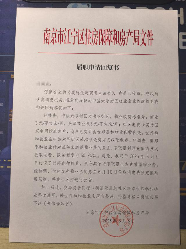 2025年4月8日,任先生就小区物业以限制缴纳电费的侵权行为向南京市江宁区住房保障和房产局递交了履行法定职责申请书。据该局出具的《履职申请回复书》显示,该局已经于2025年5月9日约谈了世邦泰和物业,责令其不得采取限电方式催缴物业费。经协调,世邦泰和物业已同意在6月10日前取消电费预充值额度限制,并在小区内进行公告。
