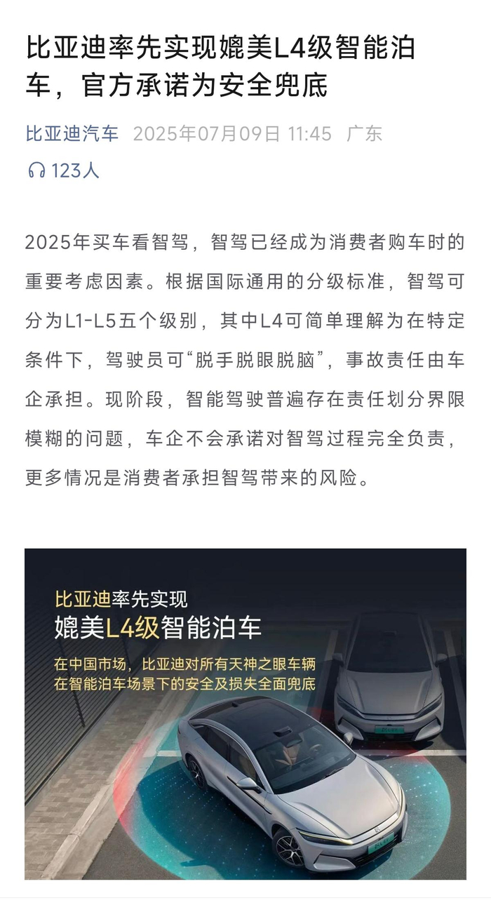 7月9日午间时候,比亚迪官微宣布为智能泊车兜底,在全球率先实现媲美L4级的智能泊车,并承诺:在中国市场,比亚迪对所有天神之眼车辆用户在智能泊车场景下的安全及损失全面兜底。