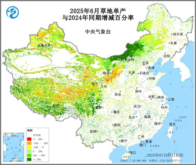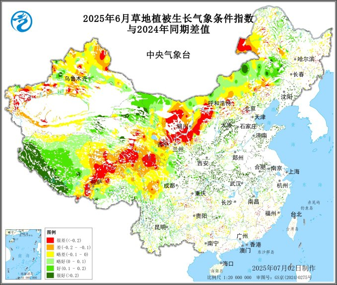 图32025年6月全国草地植被生长气象条件与2024年同期对比