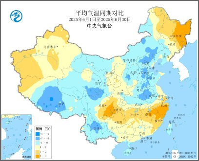 图12025年6月全国平均气温与常年(左)和2024年(右)同期对比