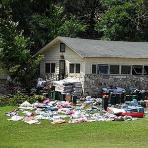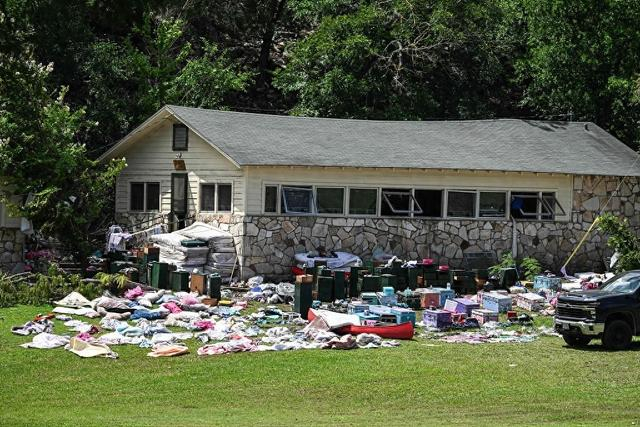 当地时间2025年7月8日,美国得克萨斯州亨特,瓜达卢佩河沿岸的神秘营地,7月4日独立日周末发生严重山洪暴发后,营地小屋外的床垫、衣物和露营者行李箱散落一地。视觉中国 图