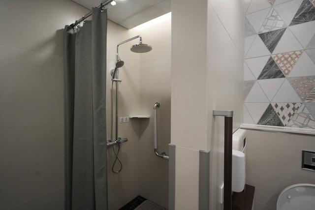 而旁边的多功能淋浴间不仅面积更大,设施也更全,适合带小孩或老人出行的家庭旅客,里面贴心设置了婴儿护理台、婴儿座椅、无障碍扶手等。