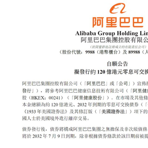 7月3日,阿里巴巴集团发布公告,计划发行本金总额约120亿港元、2032年到期的零息可交换债券。
