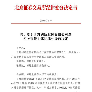 7月8日晚间,田野创新股份有限公司(832023.BJ)发布公告称,公司及董事长姚玖志、财务负责人张雄斌受到了北京证券交易所的纪律处分,并记入证券期货市场诚信档案。