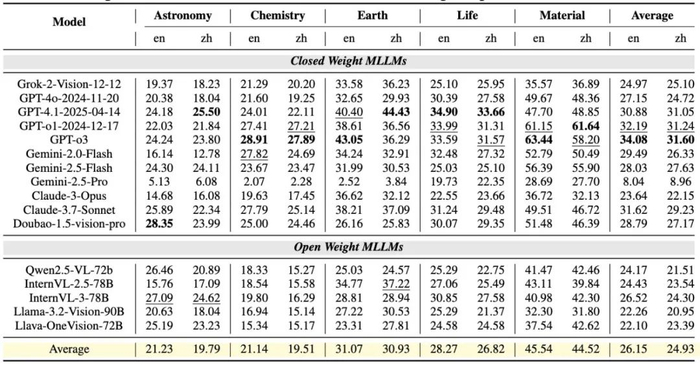 评测结果显示,材料科学是各类模型表现最好的领域,GPT-o3 在该方向的英文任务中达到 63.44%,中文任务为 58.20%,即便是开源模型(如 Qwen2.5-VL-72b、InternVL-3-78B)也能超过 40%。这种优势主要得益于材料科学任务的输入结构化明显(如相图、X 射线衍射图),模型可依赖其较强的符号化视觉信息处理能力,输出结构化的科学答案。