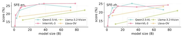 在 SFE 评测下,不同大小的 MLLMs 表现出模型规模与科学能力提升并不总是成正比。例如,Qwen2.5-VL-72B 与 InternVL-3-78B 相较于自家小模型并未显著提升,Qwen2.5-VL-72B 甚至低于 Qwen2.5-VL-7B,可能存在过拟合问题。