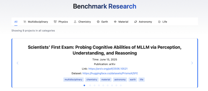 同时,平台还将通过实时追踪、自建、与社区共建等方式,维护动态更新的高质量科学评测基准数据库,以期共同推进 AI 在 Science 领域基准的进步。