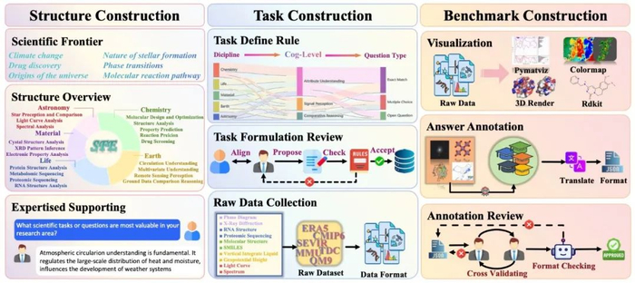 基准搭建,精选科学原始数据,进行渲染和可视化,由专家撰写高质量的 VQA 样本。