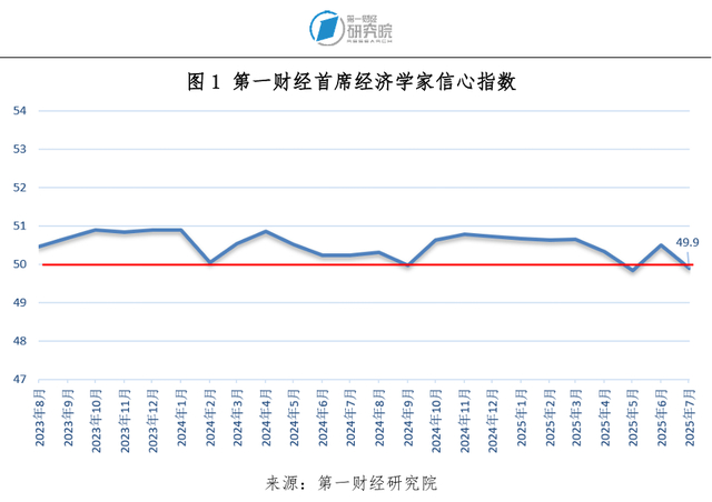 2025年7月,第一财经研究院发布的“第一财经首席经济学家信心指数”为49.9,稍低于50荣枯线。经济学家们认为未来我国经济将继续面临国内外的诸多挑战,但发展韧性和潜力仍存,景气度延续修复态势。