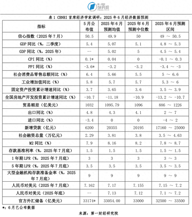 2025年7月,第一财经研究院发布的“第一财经首席经济学家信心指数”为49.9,稍低于50荣枯线。经济学家们认为我国经济将继续面临国内外的诸多挑战,但发展韧性和潜力仍存,景气度将延续修复态势;我国能够实现年初设定的年度GDP增长预期目标,对2025年度GDP同比增速的预测均值为5.02%,中位数为5%。