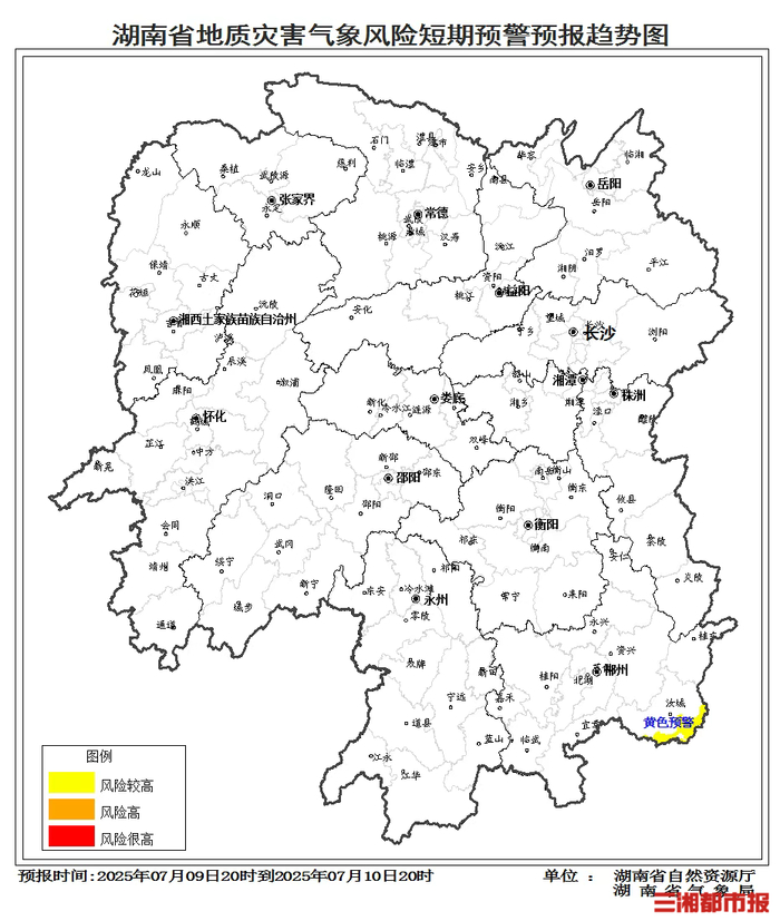 根据地质灾害成灾规律和孕灾条件,结合2025年7月9日短期气象预报情况,湖南省自然资源厅与省气象局联合会商得出如下结论:自7月9日20:00至10日20:00,受台风影响,湘东南的郴州市山地丘陵区发生突发性地质灾害风险较高黄色预警。