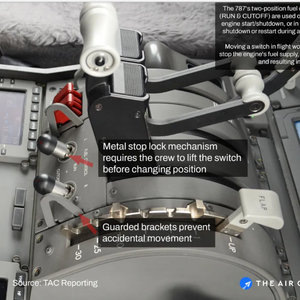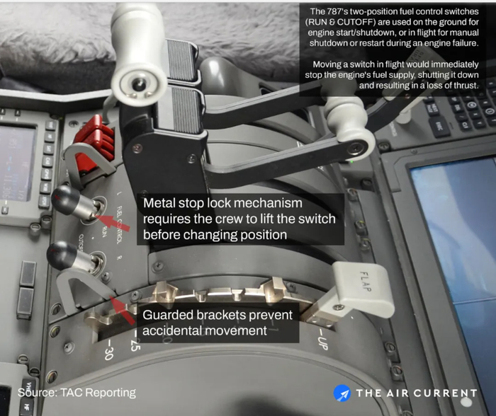 以波音787客机为例,燃油开关有运行(RUN)和关闭(CUTOFF)两个位置,仅在地面进行发动机启动和正常飞行结束时关闭,如果发动机在任何飞行阶段发生故障,机组人员需手动关闭或重启发动机。在飞行过程中,一旦将燃油控制开关从运行位切换到关闭位,流向发动机的燃油会几乎瞬间中断,导致发动机熄火,彻底失去推力。