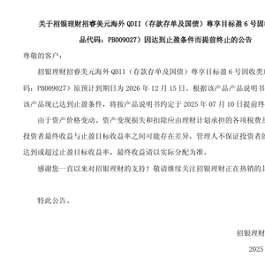 7月8日,招银理财发布公告称,该公司发行的招睿美元海外QDII(存款存单及国债)尊享目标盈6号固收类理财(产品代码:PB009027)原预计到期日为2026年12月15日。根据该产品产品说明书的相关约定,该产品现已达到止盈条件,将按产品说明书约定于2025年7月10日提前终止。