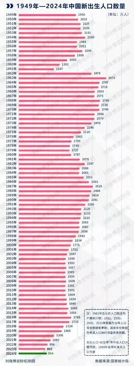 1962年到1971年这10年,是建国后重要的婴儿潮时期,每年出生率都维持在30‰以上,甚至突破过43‰。从下图可以看到,当时每年新出生人口都在2500万人以上。而目前每年新增就业人口(2007年以后出生的)大约在1600万左右。