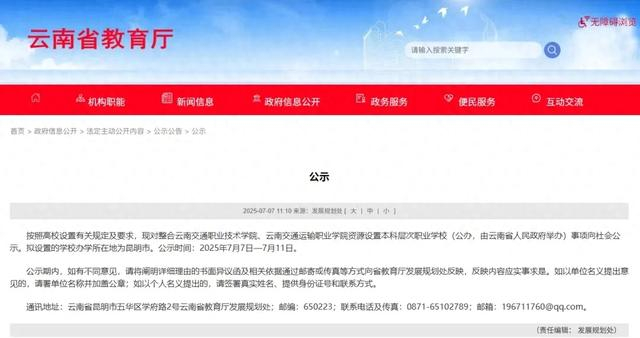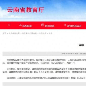 7月7日,云南省教育厅发布公示,按照高校设置有关规定及要求,现对整合云南交通职业技术学院、云南交通运输职业学院资源设置本科层次职业学校(公办,由云南省人民政府举办)事项向社会公示。拟设置的学校办学所在地为昆明市。