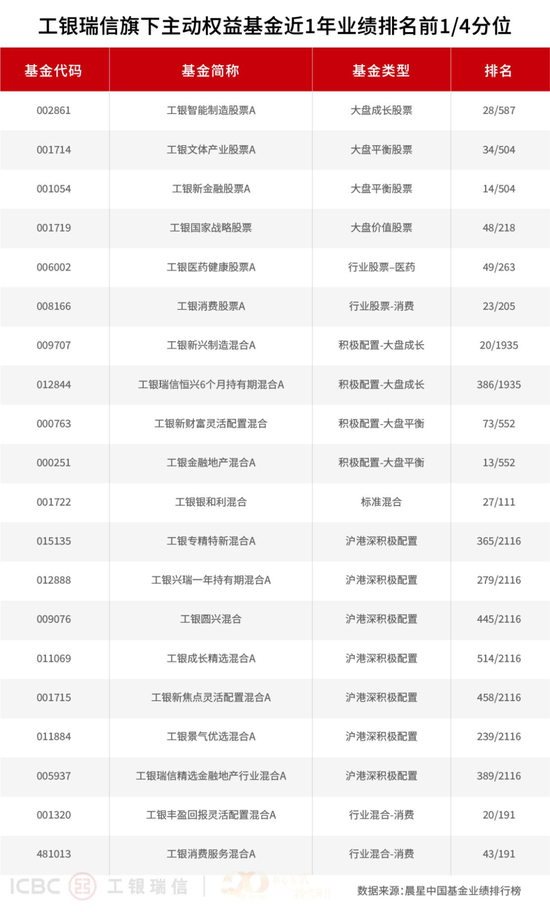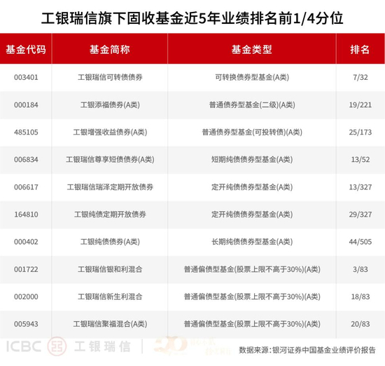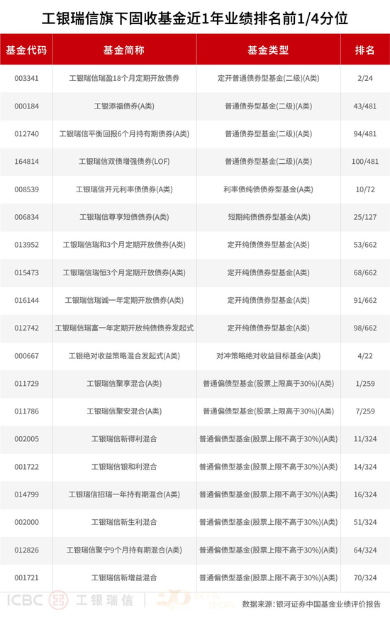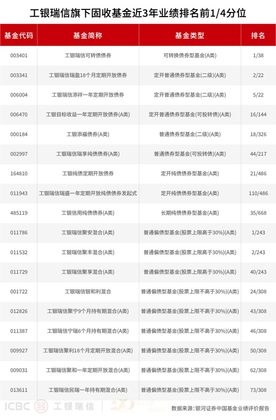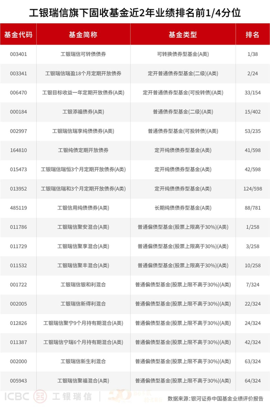 在纯债投资提供安全边际的基础上,工银瑞信积极拓展“固收+”领域,努力在控制波动和回撤的前提下获取增强收益。银河证券业绩数据生动地印证了其在“固收+”不同细分策略上的突出表现。在追求收益弹性的二级债基、可转债基金及偏债混合型基金阵营中,不乏表现抢眼的冒尖产品。银河证券数据显示,近一年,工银聚享混合A名列同类第一(1/259),工银瑞盈18个月定期开放债券名列同类第二(2/24),工银银和利混合、工银新得利两只偏债混合型基金业绩表现均名列同类产品前1/10(14/324、11/324)。
