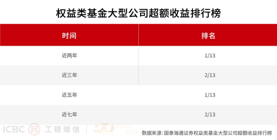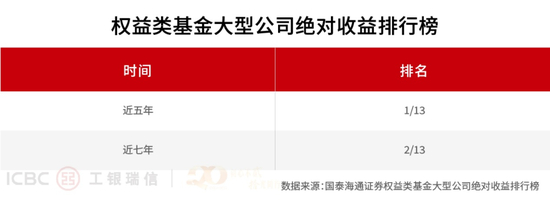 整体来看,根据国泰海通证券发布的基金公司权益类资产业绩排行榜单数据,截至2025年上半年末,工银瑞信旗下主动权益基金近五年、近七年的绝对收益,在13家权益类大型公司中分别位列第一和第二;超额收益率近五年、两年居第一,近七年、三年居第二。这份跨越周期的成绩单,是工银瑞信主动权益投资核心实力的有力注脚。