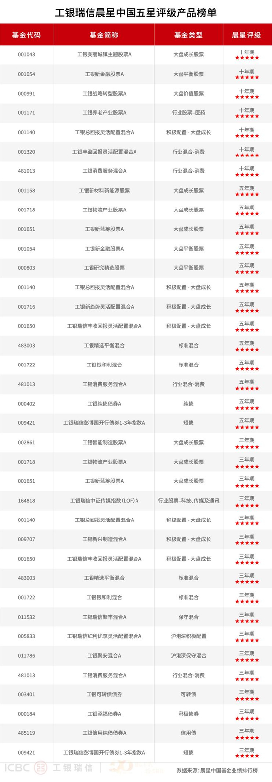 Morningstar晨星中国最新出炉的业绩榜单显示,截至6月30日,工银瑞信基金旗下17只基金获评三年期五星基金,13只基金获评五年期五星级基金,7只主动权益类基金获十年期五星基金评级。主动权益、债券、量化、QDII等领域佳品频现,以多元化的产品供给、追求可持续的业绩回报,满足投资者的财富管理需求。