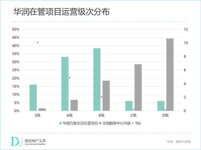 华润万象生活的优质项目数量远超行业平均。S级/A级/B级项目,全国购物中心均值占比为1.60%/6.76%/18.56%,华润万象生活占比为16.15%/33.08%/38.46%。