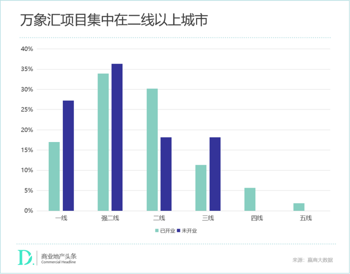 从项目所在城市线级来说,万象汇已开和筹开项目中,二线以上项目占比均超81%。这反映目前万象汇拿地策略聚焦在高能级城市,同时也证明其在高能级城市具备生存能力。