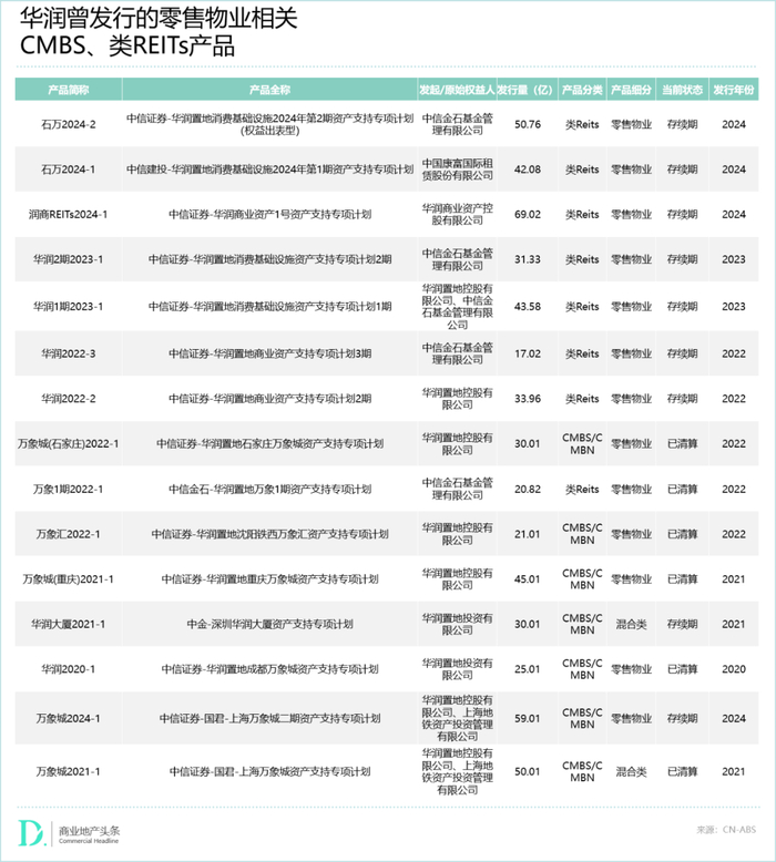 据公开资料及CN-ABS数据统计,2020年至今,包括存续期和已清算在内,华润置地以成都万象城、石家庄万象城等为基础资产,发行了大约260亿元CMBS;又以杭州萧山万象汇、北京清河万象汇、南通万象城等为基础资产,累计发行8单合计308亿元的类REITs产品。
