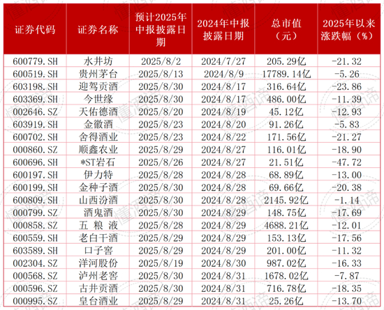 2025年,在A股的20家上市酒企当中,有一半企业预计披露中报的时间会比2024年同期有所推迟。从酒企所处的市场环境来看,二季度起实施的“禁酒令”给酒业带来的影响仍未消散。