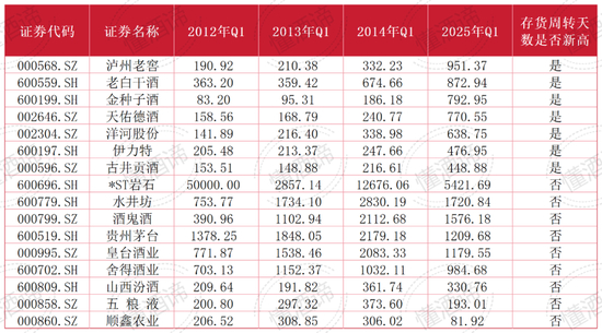 从反映库存情况的存货周转天数这一指标来看,在可分析的16家白酒企业中,泸州老窖、老白干酒、金种子酒等7家企业在2025年一季度的存货情况,已经超过了2012年至2014年同期水平,创下了阶段新高。