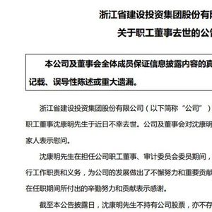 7月3日,浙江省建设投资集团股份有限公司(下称“浙江建投”)(002761.SZ)公告称,集团职工董事沈康明于近日不幸去世,年仅54岁。另有消息称,沈康明疑似坠楼身亡。