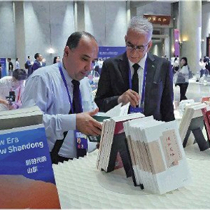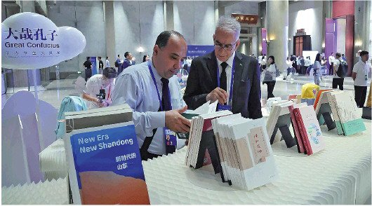 7月9日,第十一届尼山世界文明论坛上,山东文化“两创”优秀作品吸引国内外嘉宾驻足欣赏。9日上午,第十一届尼山世界文明论坛在曲阜开幕。本届论坛主题为“各美其美·美美与共——文明间关系与全球现代化”。 大众新闻记者 王世翔 摄