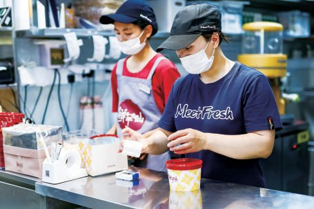 孟庆雷每天还会在各家店铺巡检,督促商家严格遵循食品安全和操作规范。例如,要求商家操作台面无油渍无灰尘,就餐低峰期所有食品要进入冰箱并加盖覆膜,食物二次分装需要封膜,还要标注时间和有效期。“高峰期店员忙不过来,我也会帮他们出单、打包。”