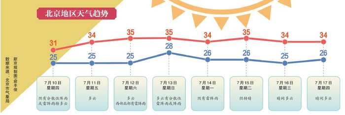 新京报讯 据预报,北京闷热的天气未来还将至少持续一周。今(10日)起一周,北京的最高气温在34℃-35℃。本周五开始,北京气温进一步升高,空气湿度增大,闷热感加剧。