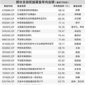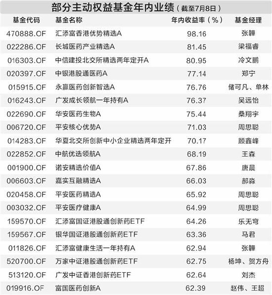 根据Wind数据统计,截至7月8日,全市场权益类基金今年以来业绩排名前十(以初始基金为统计对象)均为主动权益产品,以港股、医药、北交所这三类主题产品为主。