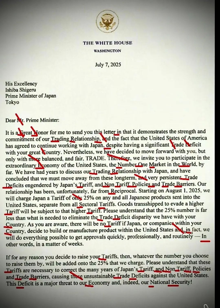 哦,特朗普之前也给日本首相石破茂写信,宣称对日本关税是25%。