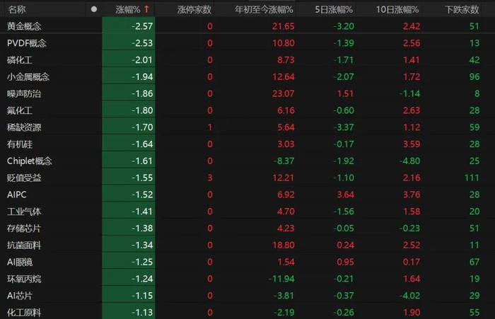 黄金概念、小金属概念领跌,Chiplet概念、工业气体、存储芯片、AI眼镜跌幅均超过1%。