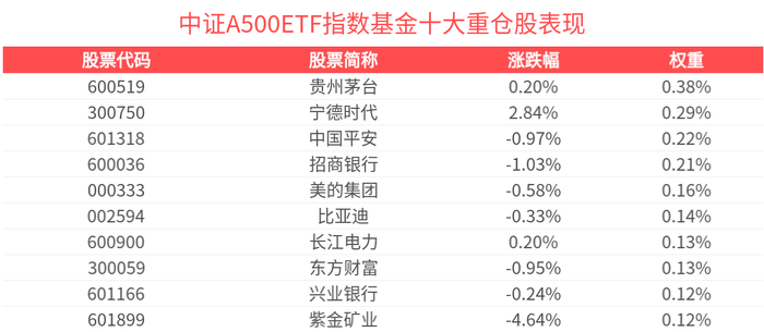 数据显示,截至2025年6月30日,中证A500指数(000510)前十大权重股分别为贵州茅台(600519)、宁德时代(300750)、中国平安(601318)、招商银行(600036)、兴业银行(601166)、长江电力(600900)、美的集团(000333)、紫金矿业(601899)、比亚迪(002594)、东方财富(300059),前十大权重股合计占比20.67%。